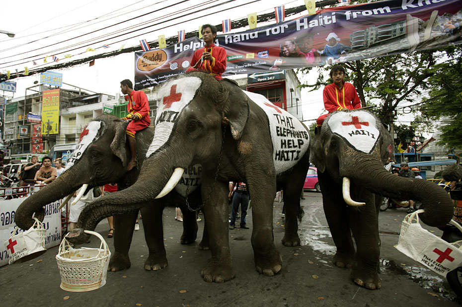 1月21日,在泰國(guó)首都曼谷舉辦了一場(chǎng)大象為海地災(zāi)區(qū)募捐活動(dòng)。人們紛紛向大象攜帶的籃子內(nèi)放入善款,向海地地震幸存者獻(xiàn)上一份愛心。圖片來源:中國(guó)新聞網(wǎng)