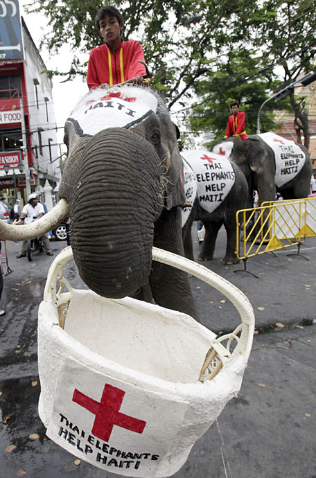 1月21日,在泰國(guó)首都曼谷舉辦了一場(chǎng)大象為海地災(zāi)區(qū)募捐活動(dòng)。人們紛紛向大象攜帶的籃子內(nèi)放入善款,向海地地震幸存者獻(xiàn)上一份愛心。圖片來(lái)源:中國(guó)新聞網(wǎng)