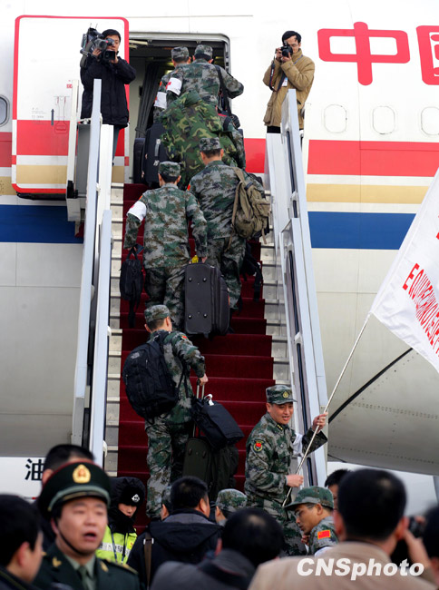 中國人民解放軍醫(yī)護人員和管理人員組成的中國醫(yī)療防疫救護隊一行40人乘坐軍運包機離開北京,啟程前往海地進行人道主義救援任務。中新社發(fā) 劉震 攝