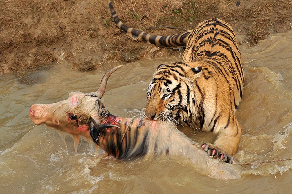 但水中的牦牛一動(dòng)彈,更加激發(fā)了老虎的野性,這時(shí)有三、四只老虎撲了上來,工作人員拼命往水塘邊上拽牦牛,無奈一只虎王一下就咬住了牦牛的脖子怎么都不肯松口,繼而上演了人和老虎的“拔河比賽”。