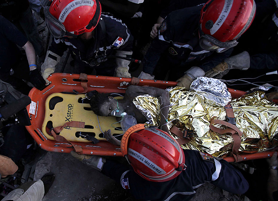 2010年1月27日,海地太子港,法國(guó)救援人員在一棟房屋的廢墟下救出被困15天的16歲女孩黛琳娜·艾提尼(Daline Etienne)。女孩微弱的話語(yǔ)讓大家著實(shí)吃驚:她竟是憑著隨身的可樂(lè)挺了過(guò)來(lái)。圖片來(lái)源:中國(guó)新聞網(wǎng)