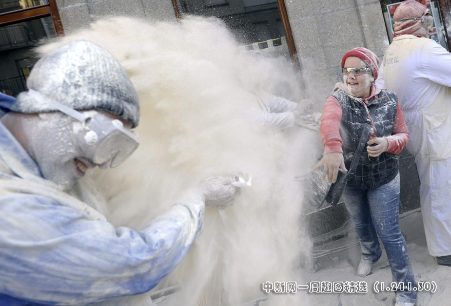 1月24日,西班牙西北部的一座村莊舉辦的狂歡節(jié)中上演瘋狂的“面粉大戰(zhàn)”。 圖片來源:中國新聞網(wǎng)>>點(diǎn)擊觀看詳細(xì)內(nèi)容
