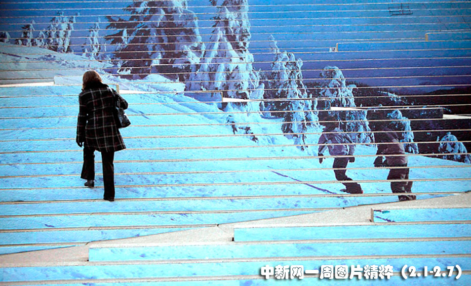 2月2日(周二),在溫哥華不列顛哥倫比亞市,一位女士在覆蓋了滑雪圖的樓梯上行進(jìn)。溫哥華冬奧會于2010年2月12日開幕。圖片來源:中國新聞網(wǎng)