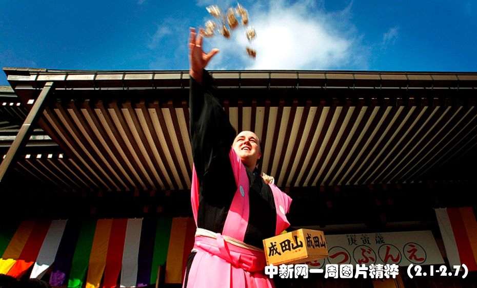 2月3日(周三),在日本千葉成田的一座寺廟,相撲新手、來自愛沙尼亞的巴魯托(Baruto)向人群拋撒袋裝的大豆。這種儀式通常在農(nóng)歷新年進(jìn)行,據(jù)說可以帶來好運。圖片來源:中國新聞網(wǎng)