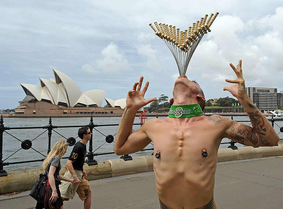 2月8日,街頭藝人Chayne Hultgren在澳大利亞悉尼海港大橋前,一次吞下18把厚約1.3厘米,長約50.8厘米的長劍,刷新了吉尼斯世界紀錄。圖片來源:中國新聞網(wǎng)