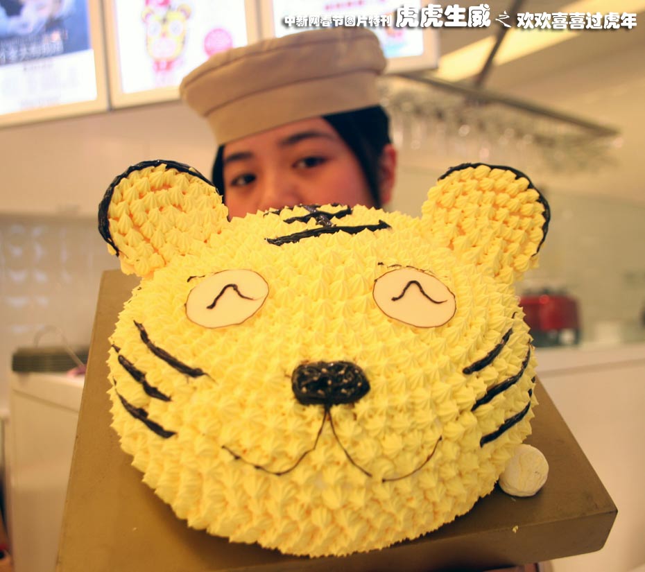 2月4日,浙江臺州市蛋糕店的點(diǎn)心師展示卡通虎臉蛋糕。中新社發(fā) 王天榮 攝