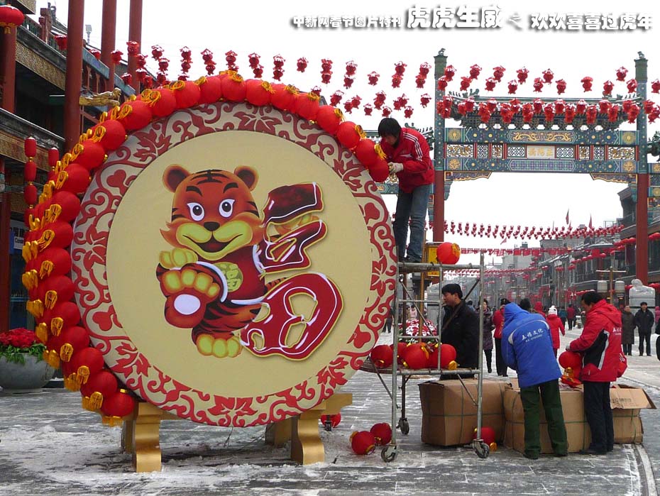 2月7日,兩個直徑3米左右的巨型“虎鼓”景觀亮相北京前門大街,與萬盞大紅燈籠交相輝映構(gòu)成一道充滿喜慶氛圍的靚麗風(fēng)景,盛裝迎接虎年新春的到來。中新社發(fā) 玉龍 攝