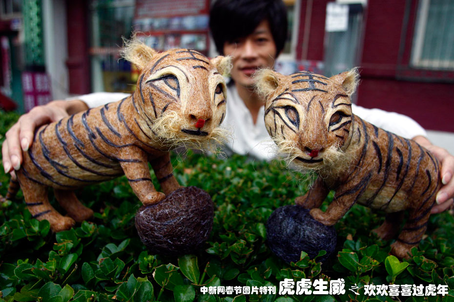 2009年11月9日,北京一位時尚發(fā)型設(shè)計師正在展示頭發(fā)絲作品“;⑸裢辟R歲虎年。這是祖國60華誕之后的又一新作,四川青年理發(fā)師黃鑫用2.6公斤碎頭發(fā)制作了一對可愛逼真的“;ⅰ,歷時兩個多月的時間才完工。中新社發(fā) 鄭雄增 攝