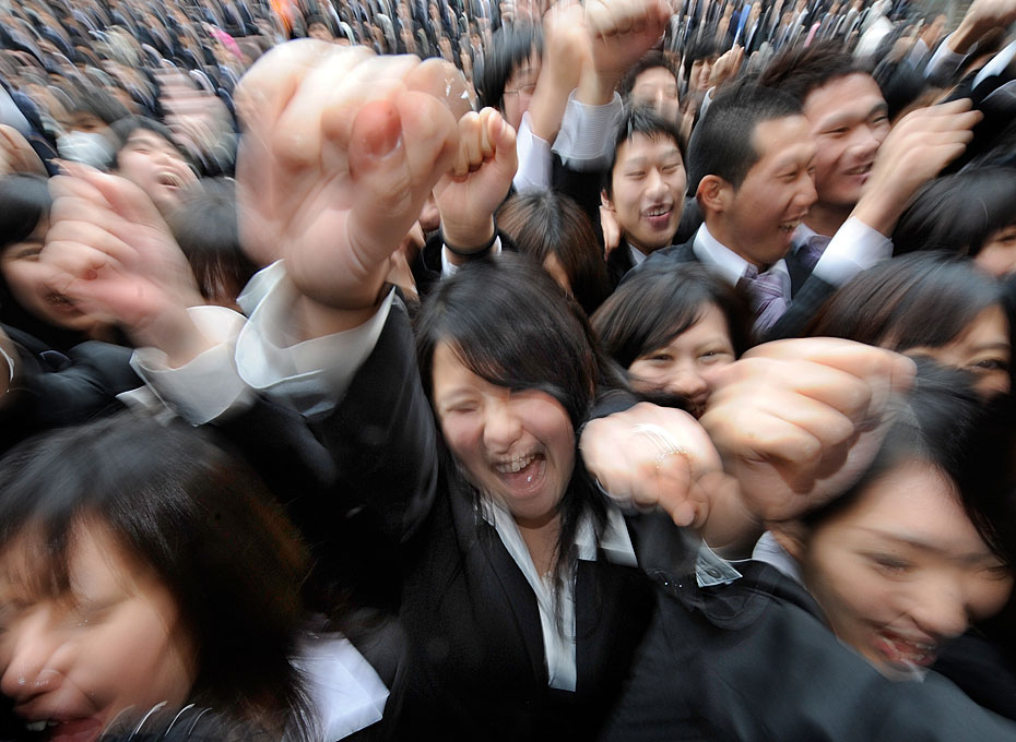 2月10日,日本東京職業(yè)學(xué)校的學(xué)生在求職動(dòng)員會(huì)上伸出拳頭展現(xiàn)信心。日本的失業(yè)率達(dá)5%,2011屆畢業(yè)生將面臨嚴(yán)峻就業(yè)形式。圖片來(lái)源:中國(guó)新聞網(wǎng)