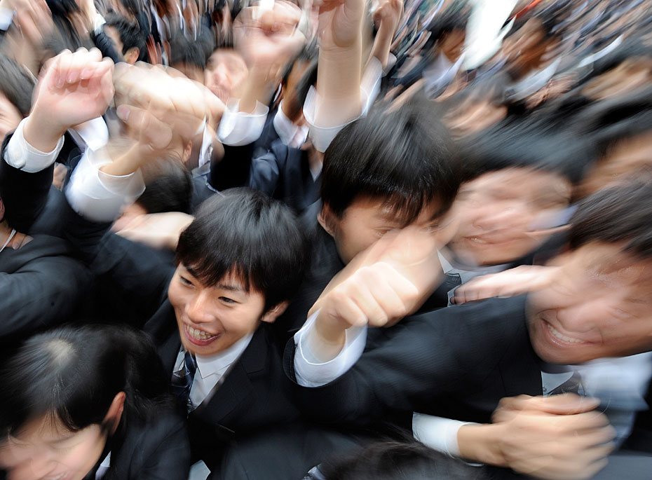 2月10日,日本東京職業(yè)學(xué)校的學(xué)生在求職動(dòng)員會(huì)上伸出拳頭展現(xiàn)信心。日本的失業(yè)率達(dá)5%,2011屆畢業(yè)生將面臨嚴(yán)峻就業(yè)形式。圖片來(lái)源:中國(guó)新聞網(wǎng)