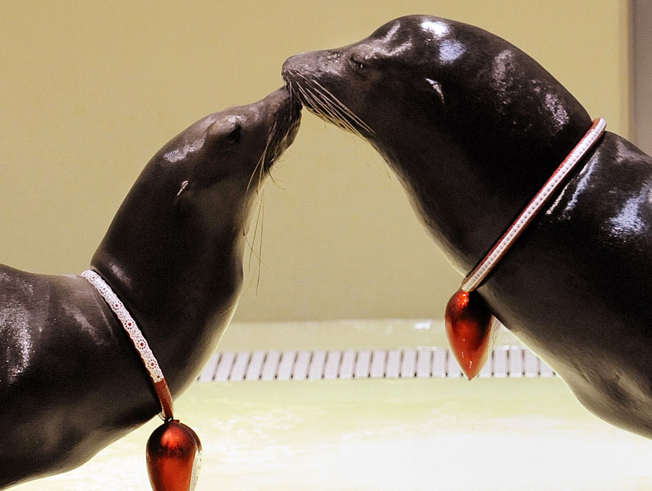 圖為日本東京水族館內(nèi)雄性海獅和雌性海獅親吻。圖片來源:中國(guó)新聞網(wǎng)