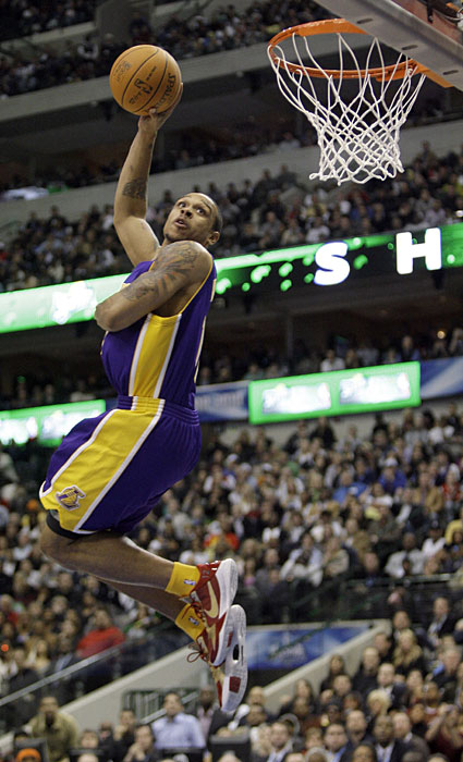 圖為洛杉磯湖人隊的香農布朗進行扣籃表演。