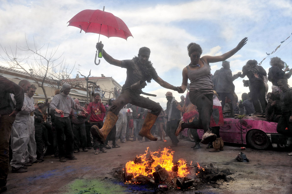 2月15日,希臘港口加拉西迪,狂歡者在街頭參加“面粉大戰(zhàn)”。“面粉大戰(zhàn)”是當(dāng)?shù)貞c?駳g季結(jié)束的一項(xiàng)傳統(tǒng)活動(dòng),隨后將是為期40天的齋戒月直至復(fù)活節(jié)。圖片來(lái)源:中國(guó)新聞網(wǎng)