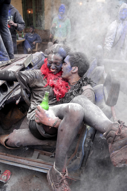 2月15日,希臘港口加拉西迪,狂歡者在街頭參加“面粉大戰(zhàn)”!懊娣鄞髴(zhàn)”是當(dāng)?shù)貞c?駳g季結(jié)束的一項(xiàng)傳統(tǒng)活動,隨后將是為期40天的齋戒月直至復(fù)活節(jié)。圖片來源:中國新聞網(wǎng)