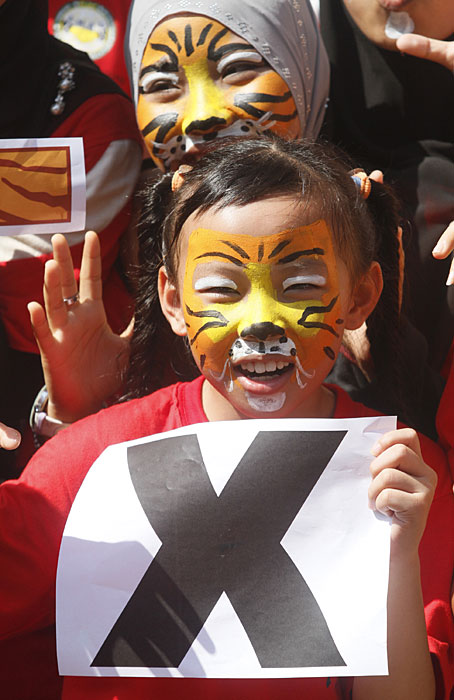 2月20日,馬來(lái)西亞民眾圍聚在首都吉隆坡附近的佛光山東禪寺,紛紛將自己繪成老虎的樣子,呼吁大家保護(hù)野生虎。圖片來(lái)源:中國(guó)新聞網(wǎng)