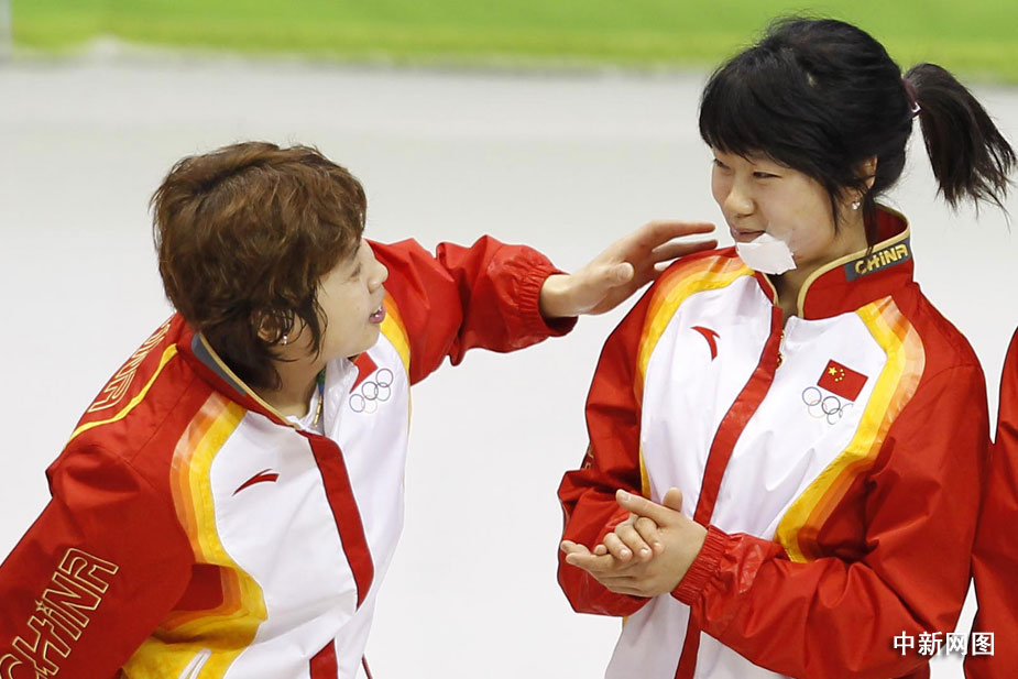 在裁判宣布韓國隊犯規(guī)后,一直等候著最終結果的中國姑娘忘情地撲向教練席。圖片清楚地顯示,興奮的王濛撲到教練李琰前面寬寬的防護墊上,她的右腿無意間高高抬起,冰刀刮到了跟在她身后的張會的下巴。王濛意識到自己闖了禍,馬上關切地回頭察看張會的傷情。四位姑娘舉著國旗慶祝勝利時,張會用手捂著她的下巴,漸漸地鮮血浸濕了她的手套。