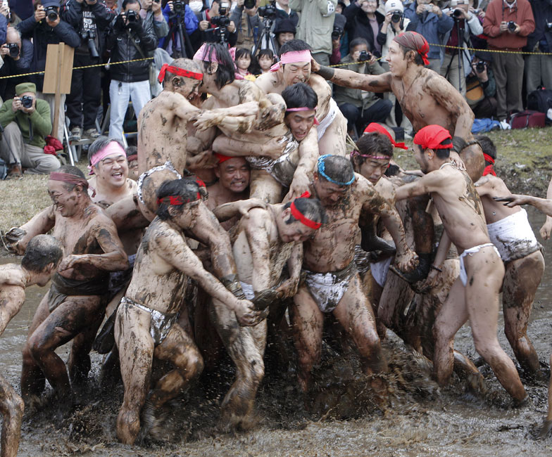 2月25日,在日本千葉縣四街道市郊外的稻田里,居民們參加一年一度的“泥漿節(jié)”。當(dāng)?shù)氐哪凶觽兂嗌硖M(jìn)稻田,把泥漿涂抹在身上。人們希望通過這種儀式祈求新的一年能有個好收成。