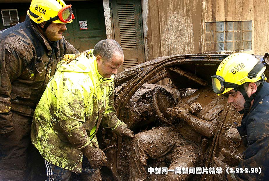 22日(周一),在葡萄牙馬德拉島豐沙爾市,救援人員在移出車廂內(nèi)的遇難者遺體。當(dāng)?shù)卣硎,由洪?zāi)引發(fā)的泥石流導(dǎo)致42人死亡,32人失蹤。