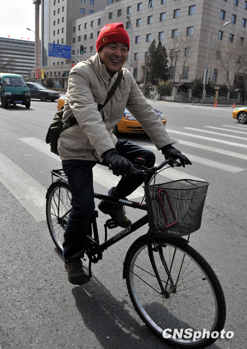 3月2日中午,全國政協(xié)委員濮存昕騎自行車去北京國際飯店,向十一屆政協(xié)三次會議會務(wù)組報到。中新社發(fā) 賈國榮 攝