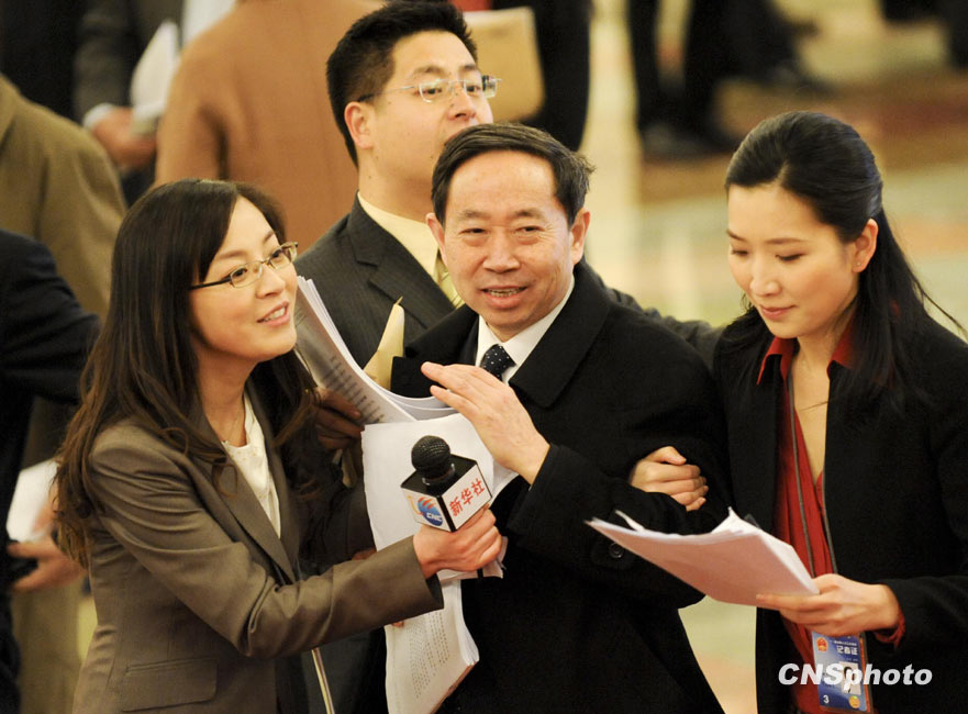 3月5日上午9時(shí),十一屆全國(guó)人大三次會(huì)議在北京隆重開幕。國(guó)務(wù)院總理溫家寶作政府工作報(bào)告。圖為教育部長(zhǎng)袁貴仁進(jìn)場(chǎng)時(shí)受到記者爭(zhēng)相采訪。中新社發(fā) 廖攀 攝