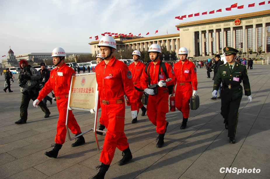 3月5日上午9時,十一屆全國人大三次會議在北京隆重開幕。國務(wù)院總理溫家寶作政府工作報告。圖為武警消防官兵提前進(jìn)入天安門廣場,保障會議安全。中新社發(fā) 柯小軍 攝