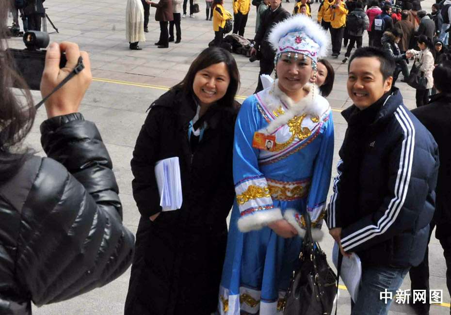 十一屆全國人大三次會議3月5日在北京開幕,各民族人大女代表的服飾靚麗多彩,在天安門廣場前大展英姿。 中新社記者 賈國榮 攝