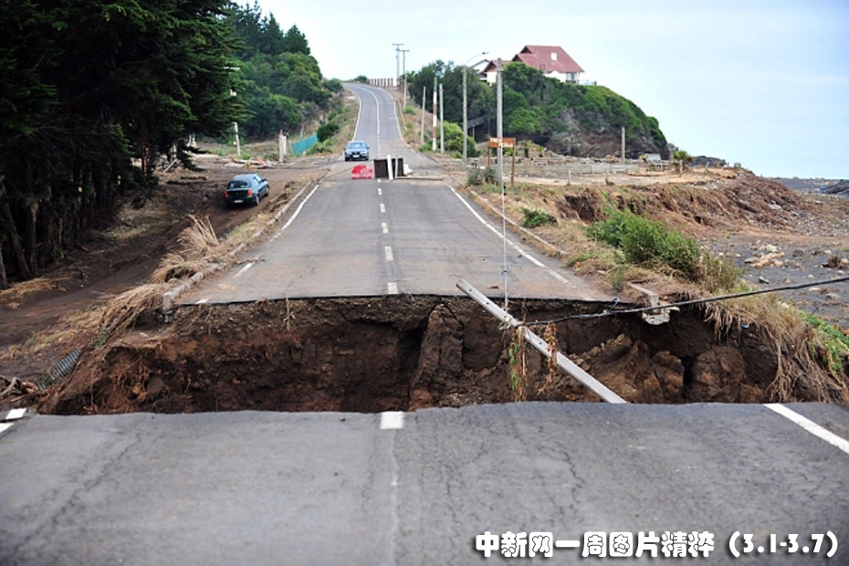 3月2日,在智利佩尤韋,一條公路發(fā)生斷裂。智利大地震已過(guò)去3天,目前已有至少796人喪身。智利總統(tǒng)巴切萊特稱,部隊(duì)已經(jīng)部署到位。此外她還會(huì)見(jiàn)了美國(guó)國(guó)務(wù)卿希拉里•克林頓。政府部門(mén)已經(jīng)開(kāi)始分發(fā)食物。圖片來(lái)源:中國(guó)新聞網(wǎng)