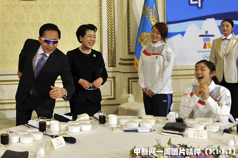 3月3日,韓國總統(tǒng)李明博在接受了韓國滑冰選手李相華(冬奧會女子500米速滑金牌)和金妍兒(女子花樣滑冰金牌)贈送的一副太陽鏡后擺出滑冰選手的造型。圖片來源:中國新聞網(wǎng)