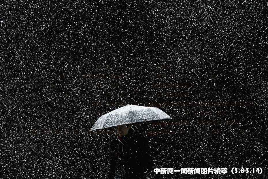周一,一名男子打著雨傘走在下著大雪的西班牙巴塞羅那街頭。圖片來源:中國新聞網(wǎng)