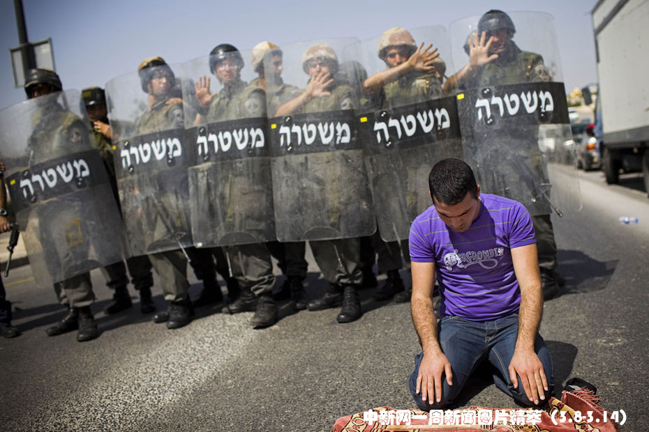 周五,一名巴勒斯坦人在耶路撒冷附近的老城做祈禱,他的身后是以色列軍警組成的人墻。圖片來源:中國新聞網(wǎng)