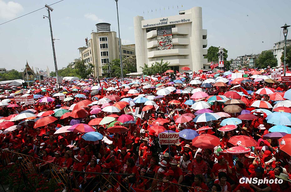 3月13日起,泰國“紅衫軍”陸續(xù)從泰國北部、東北部等外府進(jìn)入曼谷市,在集會主會場搭設(shè)演講舞臺和帳篷,拉開大規(guī)模示威序幕。圖片來源:中國新聞網(wǎng)