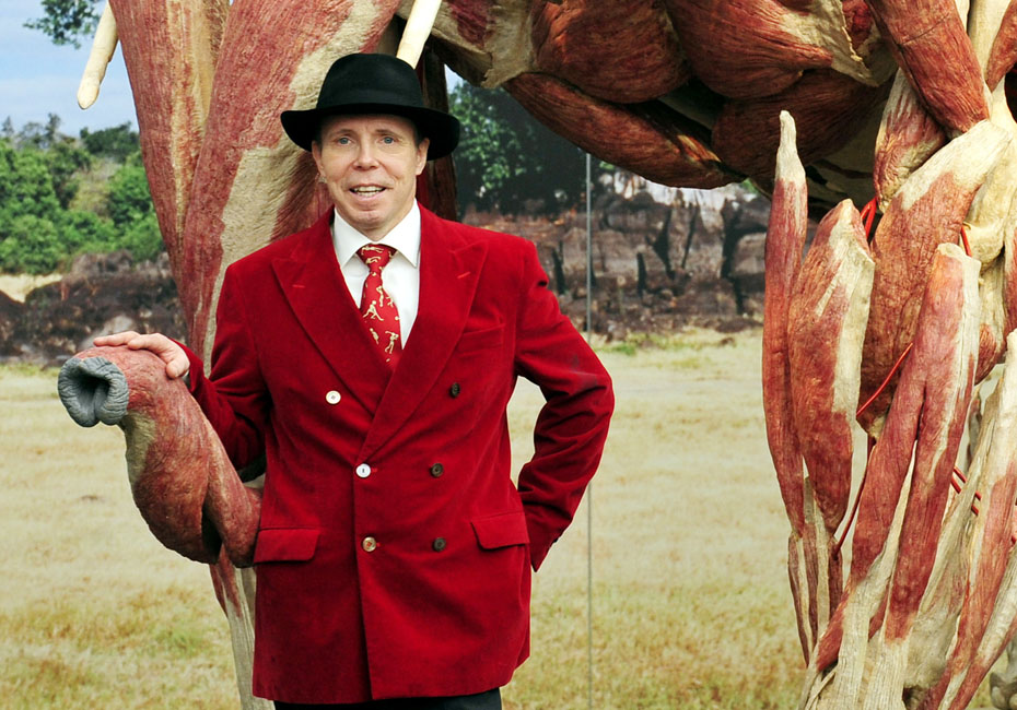 德國著名解剖學家鞏特爾·馮·哈根斯博士被稱為“死亡先生”,目前展出的是有史以來的最大的動物尸體。體型巨大的“桑芭”尸體高3.5米,重3.2噸。據(jù)悉“桑芭”將于2010年4月歸還諾因基興動物園。圖片來源:中國新聞網(wǎng)