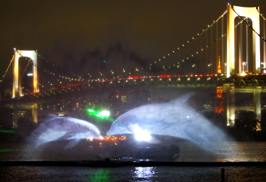 3月19日晚,在日本東京灣上演了一場(chǎng)美輪美奐的“海上幻燈”。東京灣的噴泉噴射出長(zhǎng)60米、高23米的各種海洋生物的畫(huà)面,令人驚嘆。