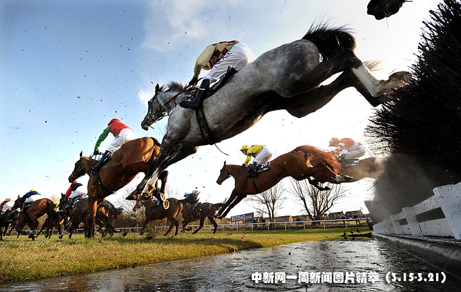 16日(周二),在英國切爾滕納姆節(jié)冠軍障礙賽上,眾多賽馬正在沖過障礙。