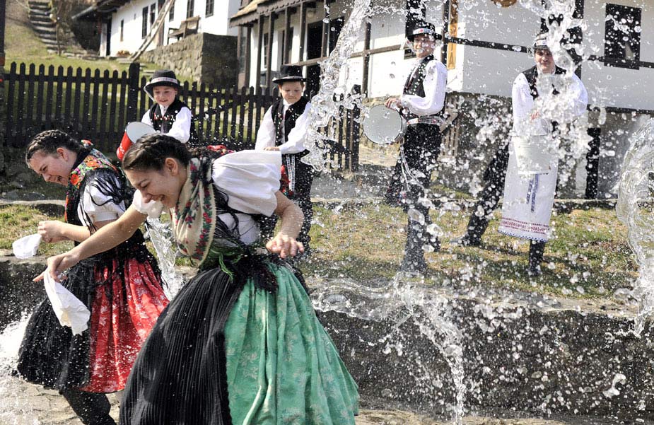 3月26日,在匈牙利首都布達(dá)佩斯以東被譽(yù)為世界文化遺產(chǎn)的霍洛克村,當(dāng)?shù)鼐用褚韵蚬媚锷砩蠞娝膫鹘y(tǒng)儀式慶祝復(fù)活節(jié)。此項古老習(xí)俗起源于公元2世紀(jì)。
