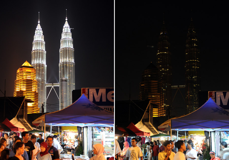 由世界自然基金會發(fā)起的“地球一小時”環(huán);顒27日20點30分按照時區(qū)依次在全球數(shù)千個城市展開。圖為馬來西亞吉隆坡雙子星塔在參與“地球一小時”熄燈活動前與熄燈后的情況。