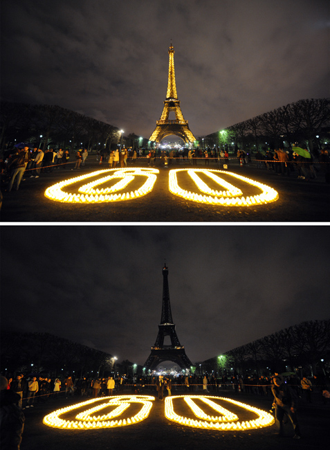 由世界自然基金會發(fā)起的“地球一小時”環(huán)保活動27日20點30分按照時區(qū)依次在全球數(shù)千個城市展開。圖為法國巴黎埃菲爾鐵塔熄燈后和亮燈后的照片。
