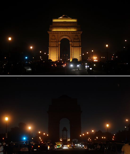 由世界自然基金會發(fā)起的“地球一小時”環(huán);顒27日20點30分按照時區(qū)依次在全球數(shù)千個城市展開。圖為印度門在熄燈前和熄燈后的景色。