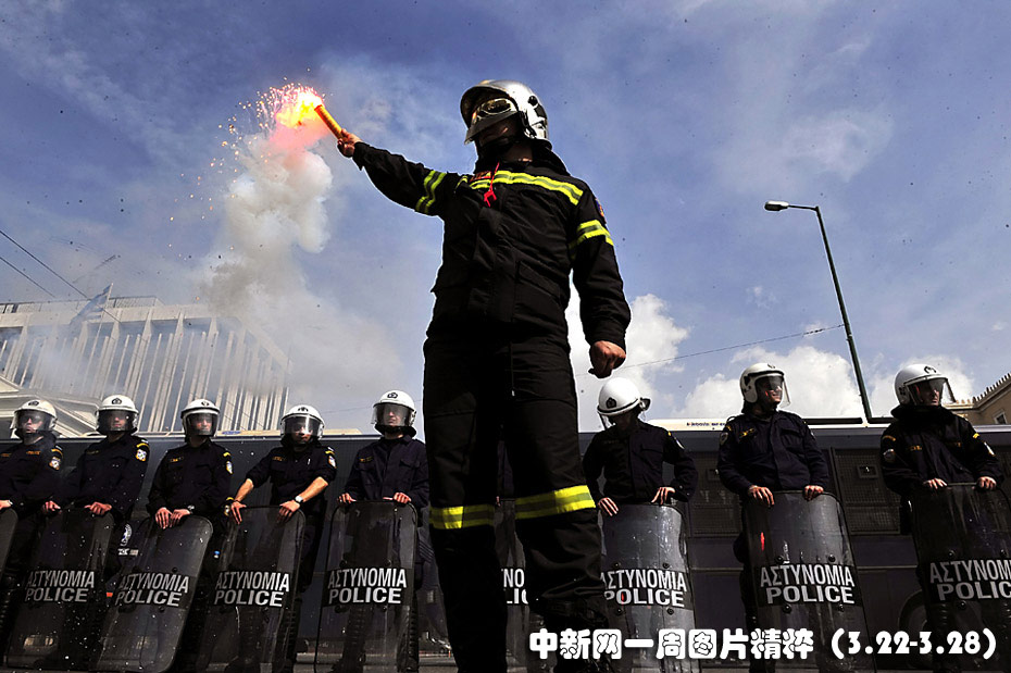 3月23日,在希臘雅典,警察封鎖了希臘國(guó)會(huì)的入口,一名抗議示威的消防隊(duì)員在一旁點(diǎn)燃了手中的燃燒棒。希臘政府表示,希望能在即將召開(kāi)的歐盟首腦峰會(huì)上解決希臘的債務(wù)問(wèn)題。