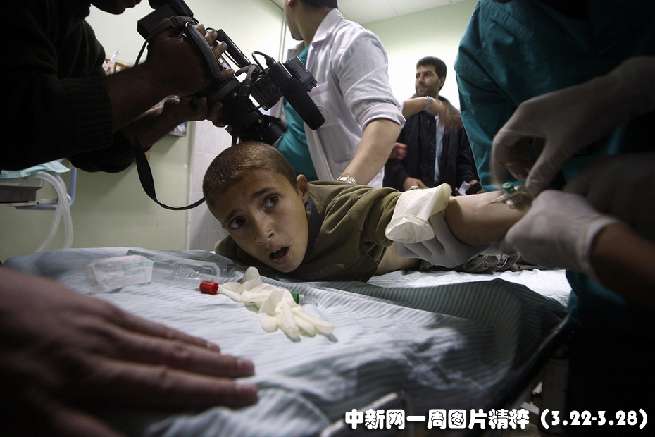 3月26日,加沙地帶的醫(yī)務(wù)人員正在治療一個被彈片擊中的男孩。在交火中兩名以色列士兵和兩名巴勒斯坦人被打死。