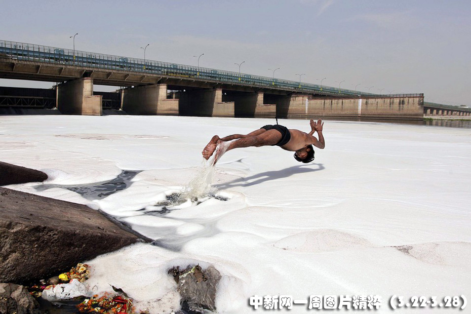 3月22日,新德里一名男子跳進(jìn)遭到污染的亞穆納河。有關(guān)官員稱(chēng),工廠無(wú)視法規(guī)傾倒未經(jīng)處理的污水和工業(yè)廢水,使有毒物質(zhì)流入河水中。