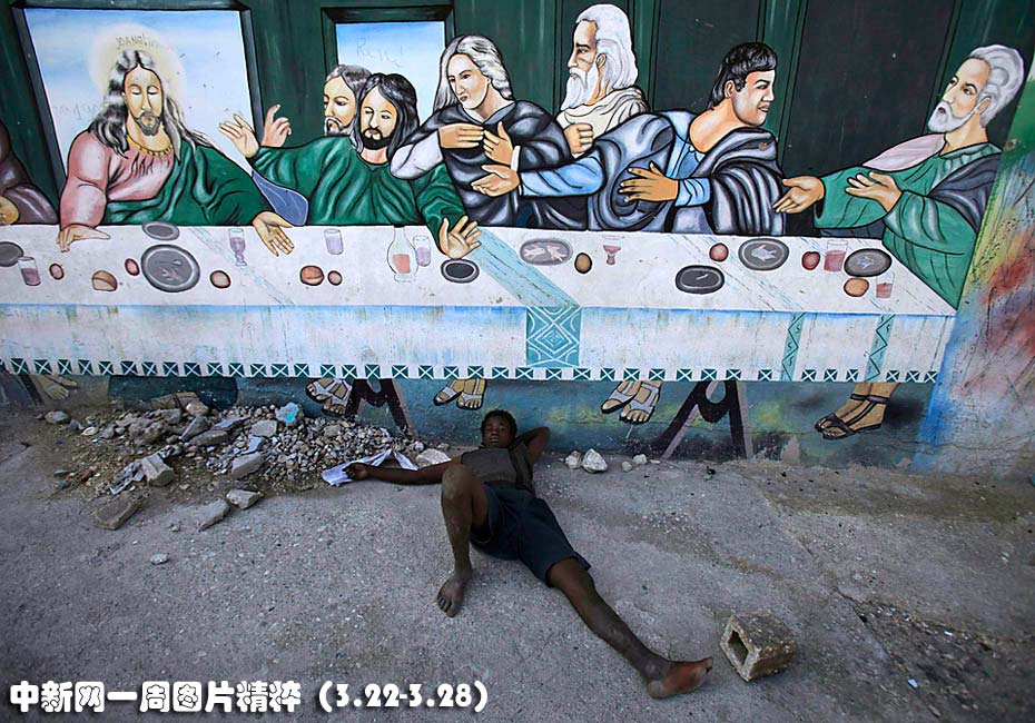 3月22日,在海地太子港一名男子睡躺在壁畫《最后的晚餐》前面。