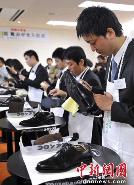4月1日,日本一家鞋油廠新員工在入職儀式上為老員工擦鞋。圖片來(lái)源:中國(guó)新聞網(wǎng)