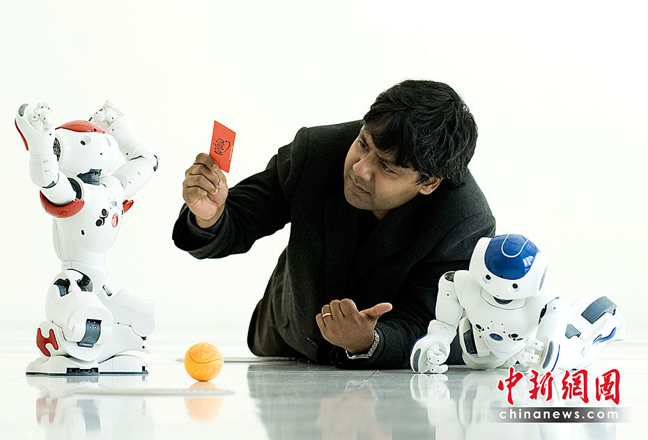 機(jī)器人足球隊(duì)在英國(guó)愛(ài)丁堡國(guó)際科學(xué)節(jié)亮相,它們由愛(ài)丁堡大學(xué)研制而成。機(jī)器人足球隊(duì)員內(nèi)置處理器可以感受周?chē)沫h(huán)境和其他機(jī)器人的反應(yīng)。圖片來(lái)源:中國(guó)新聞網(wǎng)