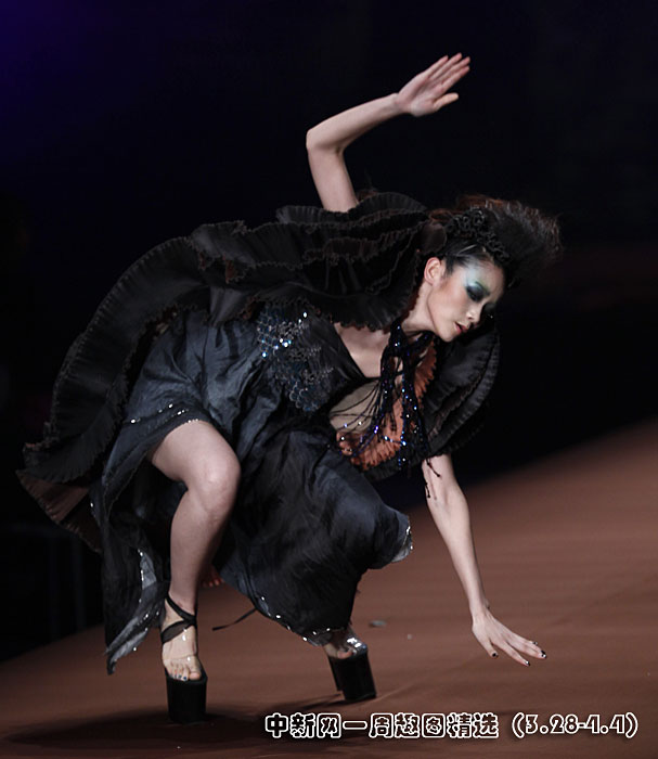3月29日晚,旭化成·中國時(shí)裝設(shè)計(jì)師創(chuàng)意大獎(jiǎng)張義超作品發(fā)布會(huì)在北京舉行,一名模特在T型臺(tái)上“失足”摔倒。圖片來源:中國新聞網(wǎng)>>點(diǎn)擊觀看詳細(xì)內(nèi)容
