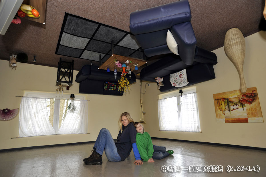 3月30日,德國蓋托夫市“瘋狂的房子”面向公眾開放。該房屋整個顛倒里面的家具也是被釘在屋頂上的。圖片來源:中國新聞網(wǎng)>>點擊觀看詳細內(nèi)容