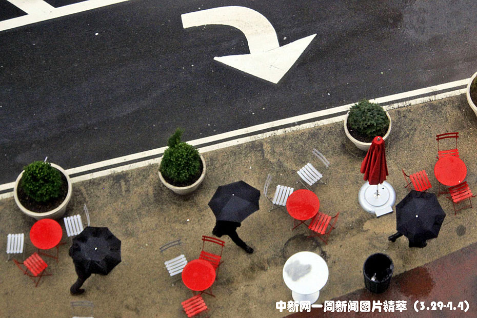 周一(29日),行人在雨中穿過紐約時代廣場。早前一場暴風雨席卷了美國東北部。