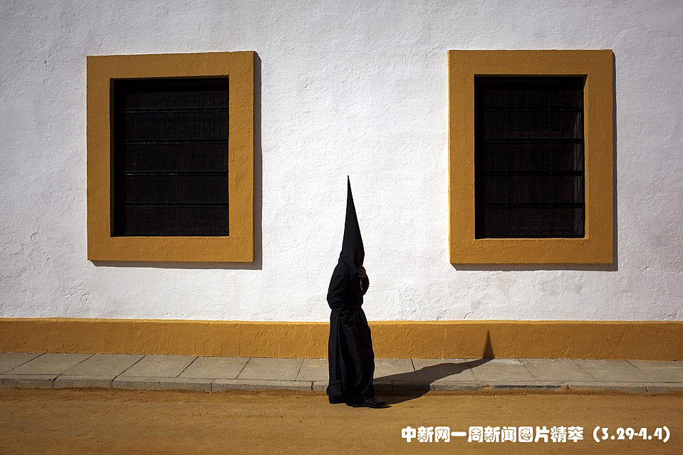 周三(31日),西班牙塞維利亞,一名“La Sed”教徒走在去教堂參加游行的路上。
