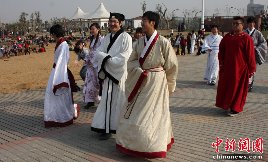 4日,通過網(wǎng)絡(luò)結(jié)交崇尚漢文化的青年網(wǎng)友相約在棗莊東湖公園,一起切磋漢文化。當(dāng)日,通過網(wǎng)絡(luò)結(jié)交崇尚漢文化的14名青年網(wǎng)友,利用清明小長假相約在山東省棗莊東湖公園,身著漢服踏青交友,感受漢文化。中新社發(fā) 吉 喆 攝