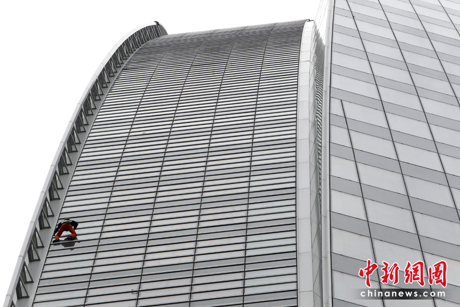 4月7日,巴黎,法國“蜘蛛人”羅伯特當(dāng)日用了大約50分鐘成功攀爬185米高的法國燃?xì)馓K伊士集團(tuán)大樓。 圖片來源:中國新聞網(wǎng)
